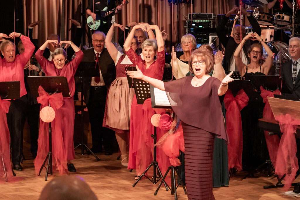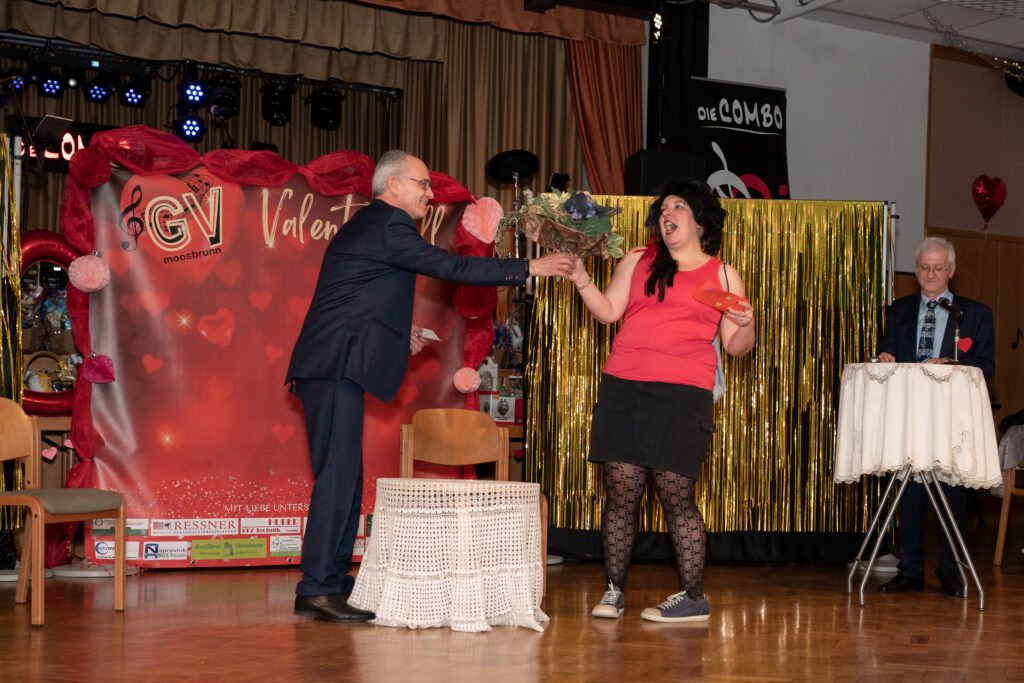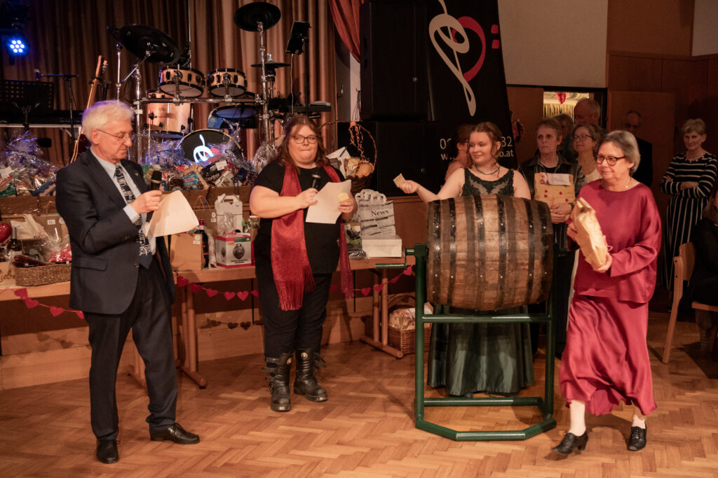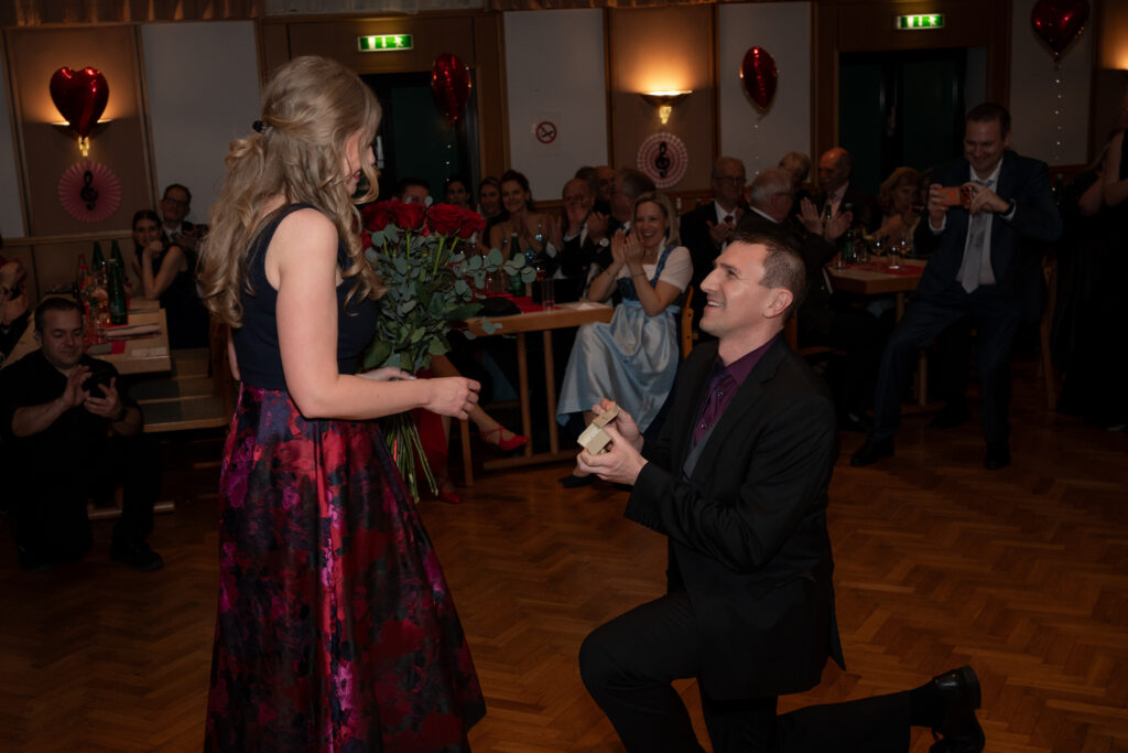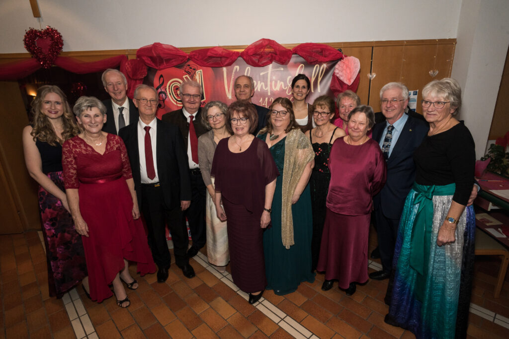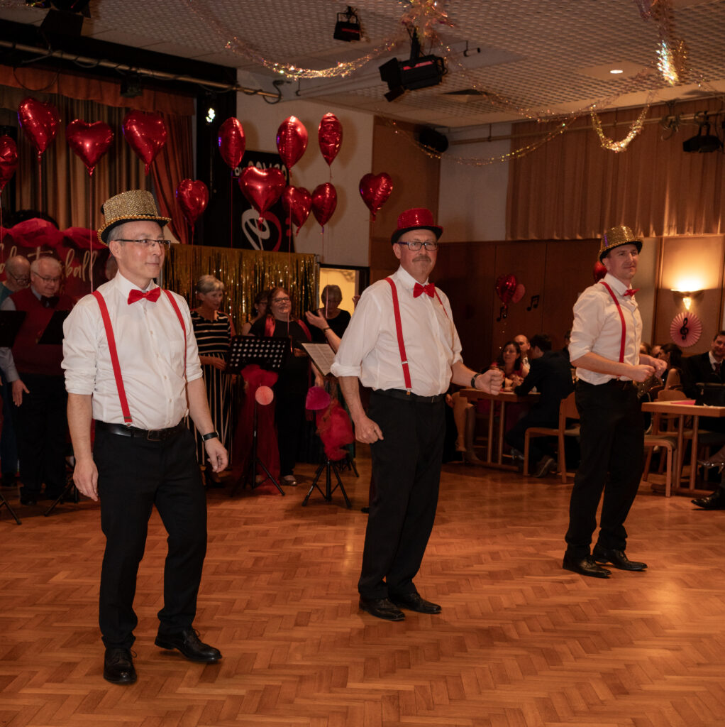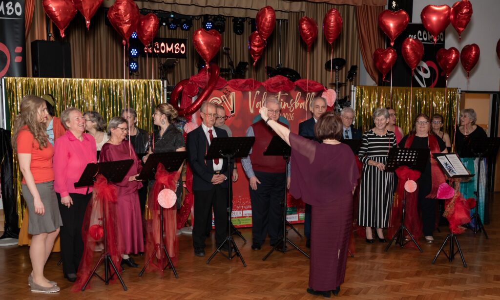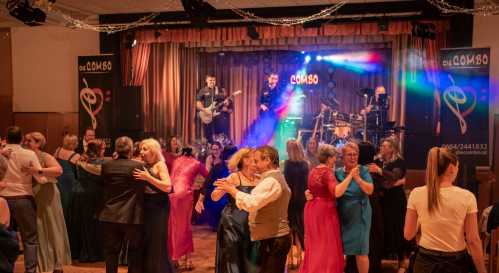 Die Gäste wurden mit einem Glas Sekt begrüßt, und vor der „Love Wall“ im Foyer entstanden viele stimmungsvolle Erinnerungsfotos. Die musikalische Eröffnung gestaltete der Chor selbst mit dem Beatles-Hit „All You Need Is Love“ – ein passender Auftakt für diesen besonderen Abend. Die Livemusikgruppe „dieCOMBO“ aus dem Burgenland unterhielt die Besucher musikalisch hervorragend, von schwungvollen Tanznummern bis hin zu echten Schmusesongs, während das Restaurant „s’Platzl“ die Gäste kulinarisch verwöhnte. Nach einem Schätzspiel sorgte ein überraschender Heiratsantrag an eine Sängerin des Chores für bewegende, romantische Momente und große Freude im Saal. Zur Mitternachtspause präsentierte der Chor gemeinsam mit einem Tänzertrio den Hit „Save Your Kisses for Me“ von Brotherhood of Man. Anschließend unterhielt ein humorvoller Sketch zum Thema „Speed Dating“, bevor die gemeinsam mit dem Publikum gesungene Ortshymne „In Moosbrunn, da is’ so g´miatlich“ mit einer eigens für den Ballabend getexteten Valentinsstrophe das Programm der Mitternachtseinlage abschloss.